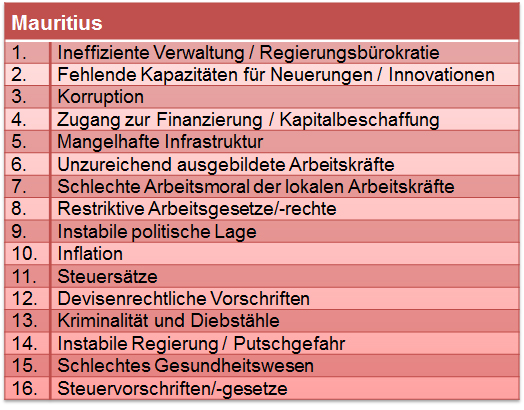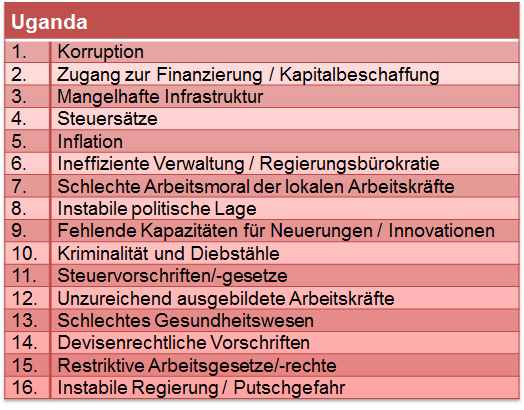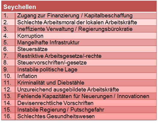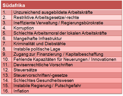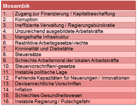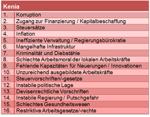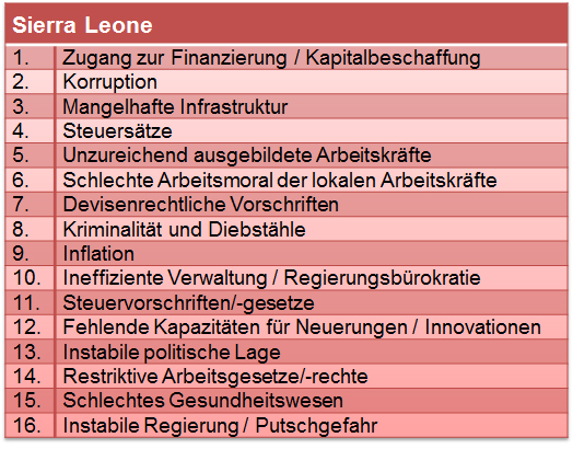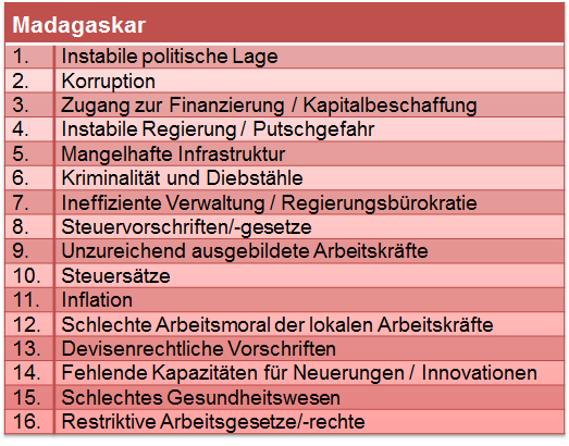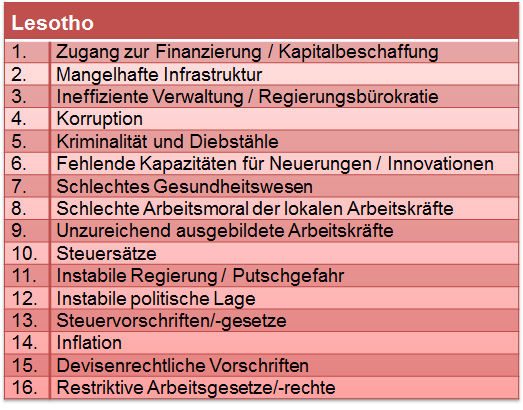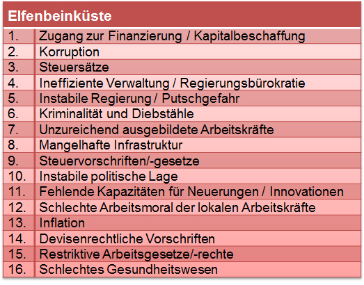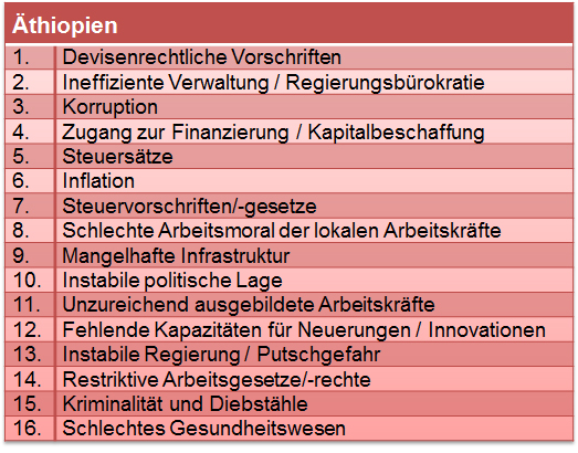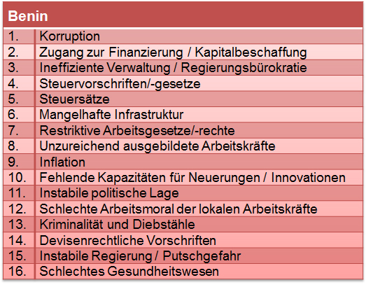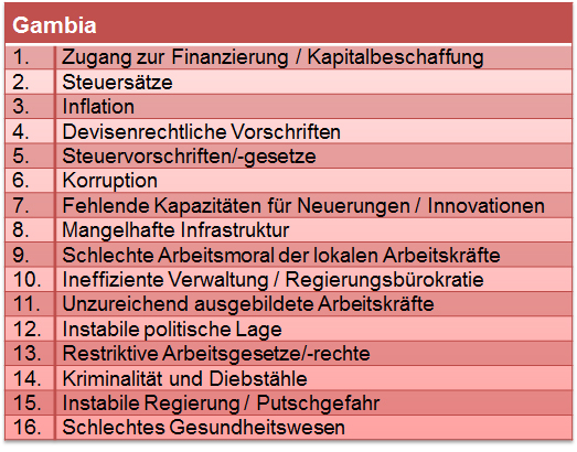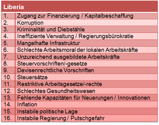 Die Länderübersichten zeigen Faktoren, die von lokalen Führungskräften als am hinderlichsten für eine Geschäftstätigkeit in ihrem Land angesehen werden. Die Angaben beruhen auf der „World Economic Forum’s Executive Opinion Survey 2013” des World Economic Forum. Die Teilnehmer der Umfrage haben aus 16 Kriterien die fünf problematischsten Punkte für ihr Land identifiziert. Die Ergebnisse wurden nach ihrer Antworthäufigkeit zusammengefasst und gewichtet (1 stärkste Ausprägung, 16 schwächste Ausprägung).