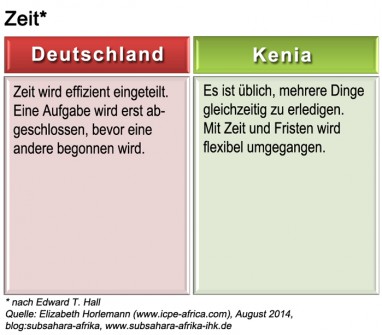 Das folgende Beispiel macht das unterschiedliche Zeitverständnis deutlich: Wenn sich ein Deutscher bei einem Termin verspätet, wird er sofort anrufen und ein sehr präzises Zeitfenster für seine Ankunft nennen. Ein Kenianer hingegen wird nicht anrufen, geschweige denn sich am nächsten Tag entschuldigen, dass er zum Termin nicht erschienen ist. Für Deutsche ist dies ein Zeichen von Unzuverlässigkeit. In Kenia jedoch gilt: Je wichtiger der Status einer Person, desto später erscheint sie zu einem geschäftlichen Termin. Auch erwartet ein deutscher Geschäftsmann den zügigen Abschluss von Verhandlungen, an deren Ende er den Abschluss eines Vertrages erwartet. Der Kenianer hingegen pflegt einen flexiblen Umgang mit Zeit und Fristen.