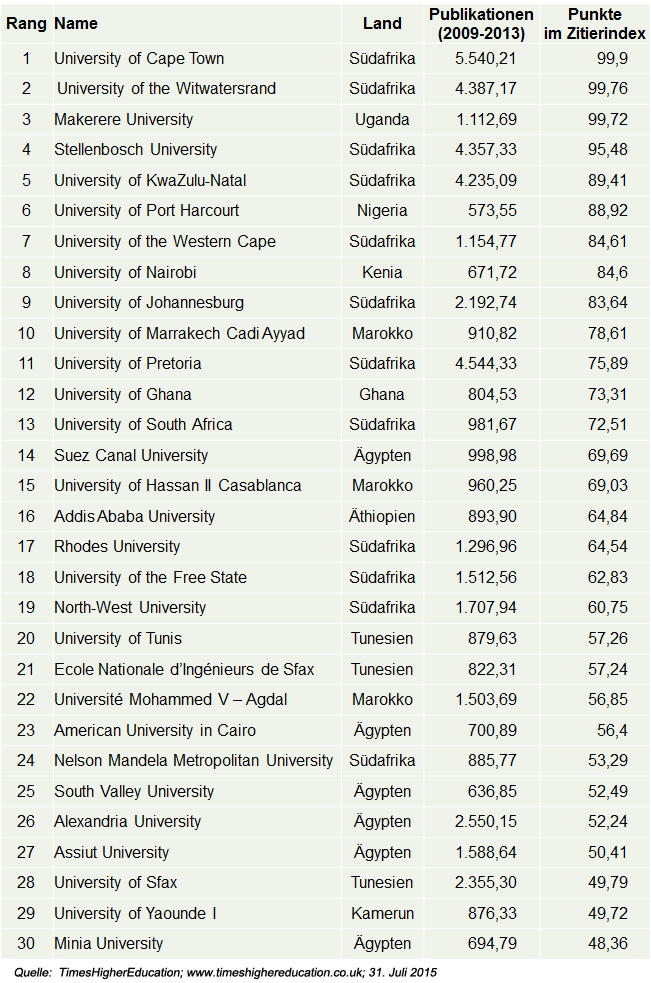 Das britische Magazin Times Higher Education (THE) hat einen Überblick über die 30 besten Universitäten des afrikanischen Kontinents veröffentlicht. 18 der Top-Universitäten befinden sich in Ländern südlich der Sahara. Alleine 12 davon haben ihren Sitz in Südafrika. Das komplette Ranking gibt es hier.