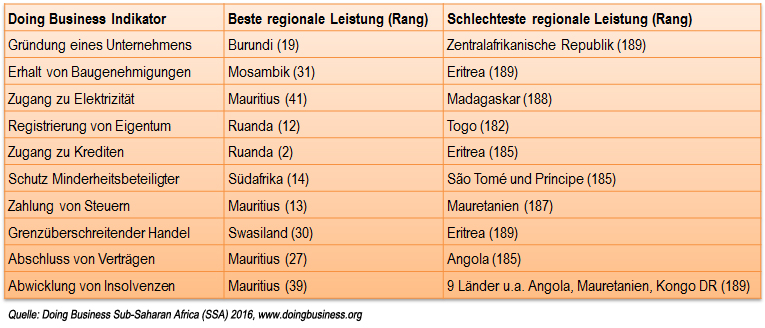 Mit Rang 32 bietet Mauritius die besten unternehmerischen Voraussetzungen südlich der Sahara, gefolgt von Ruanda auf Platz 62, Botswana (72) und Südafrika (73). Bemerkenswert ist, dass Ruanda weltweit auf Platz 2 bei der Einfachheit der Beschaffung von Krediten und auf Rang 12 bei der Unternehmensregistrierung liegt.