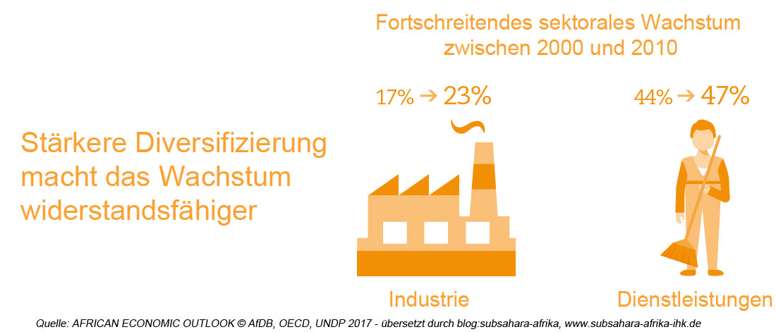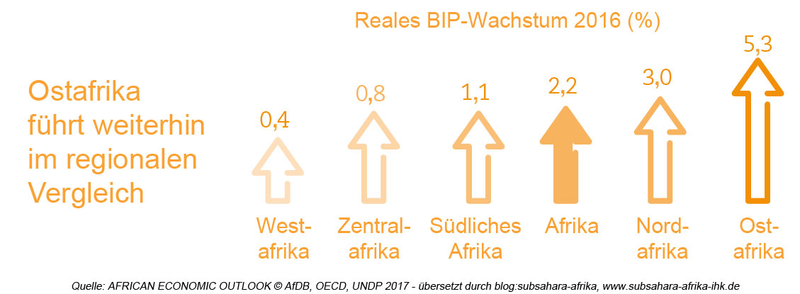 Laut AEO 2017 sank das Wirtschaftswachstum Afrikas 2016 auf 2,2 % (3,4 % in 2015). Zurückzuführen ist der Rückgang auf niedrige Rohstoffpreise, die angespannte weltwirtschaftliche Lage und schlechte Wetterbedingungen, die insbesondere die landwirtschaftliche Produktion trafen. Im regionalen Vergleich hat Ostafrika (5,3 % regionales BIP) die beste Entwicklung gezeigt, während Westafrika (0,4 % regionales BIP) die schlechteste Wirtschaftsleistung erbracht hat. Während die rohstoffabhängigen Länder ein schweres Jahr hatten, konnten die Märkte, die Exporte jenseits des Rohstoffsektors tätigten, Gewinne erzielen und wachsen. Nicht nur wirtschaftlich sind große Entwicklungsunterschiede zwischen einzelnen Ländern zu beobachten, sondern auch in Bezug auf Gesundheit, Bildung und Lebensstandards.