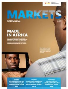 Die Ausgabe 5/2017 des Wirtschaftsmagazins „markets International“ der bundeseigenen Außenwirtschaftsförderungsagentur Germany Trade & Invest (GTaI) mit dem Schwerpunktthema „Made in Africa“ widmet sich den aktuell für deutsche Unternehmen besonders chancenträchtigen Wirtschaftssektoren. Neben der Energiewirtschaft in Westafrika, sind das der private Konsum in Ostafrika sowie der Gesundheitssektor im südlichen Afrika, so die Experten der GTaI. Das Magazin ist kostenfrei als Print- oder als PDF-Variante zu beziehen unter www.gtai.de/markets-digital.