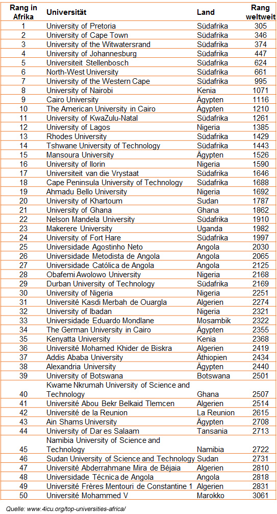 Im weltweiten Vergleich liegen Afrikas Top-50 mit einer breiten Spannweite auf den Rängen 305 bis 3061 verteilt. Zum Vergleich, die laut uniRank renommiertesten Universitäten weltweit sind auf Platz eins das Massachusetts Institute of Technology, gefolgt von der Harvard- und der Stanford-University. Die beste deutsche Hochschule ist die Universität München auf Rang 136.