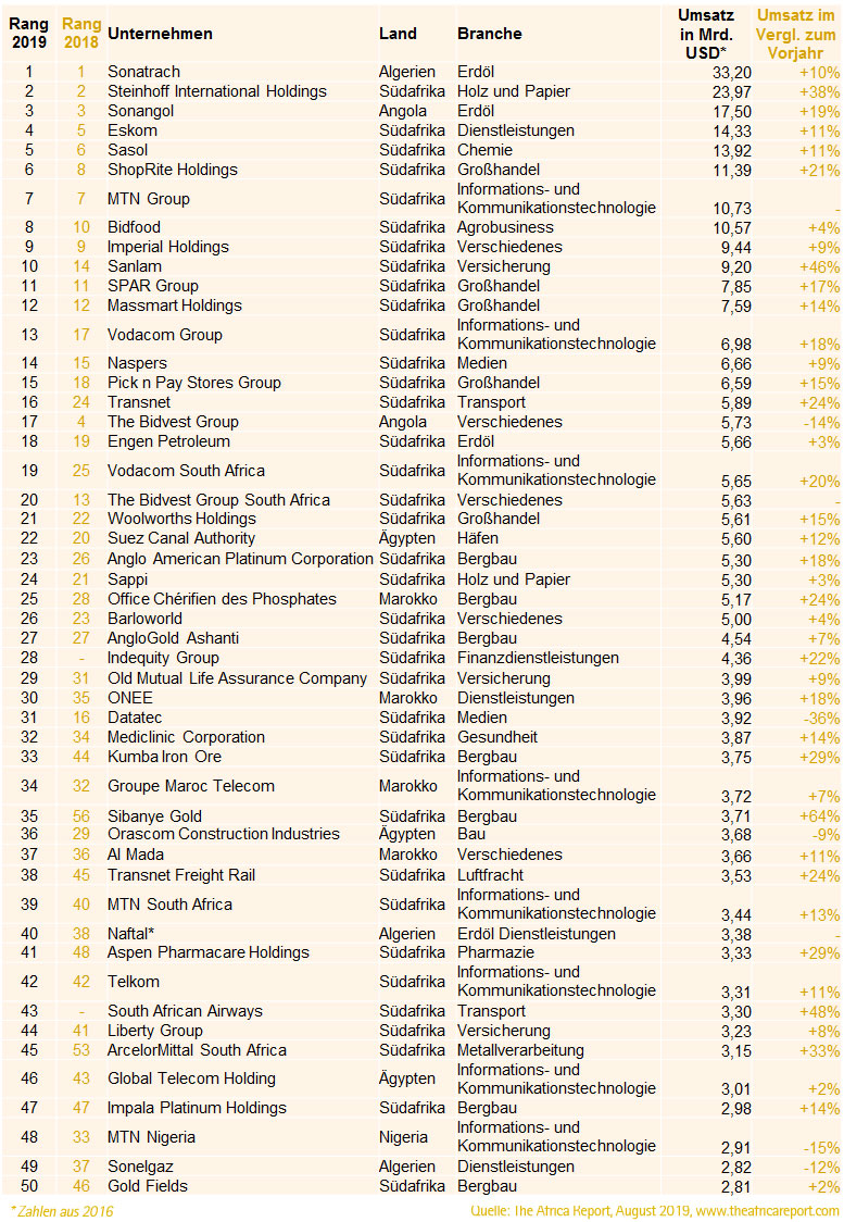 Mit einem Umsatz von 33,2 und 24,0 Mrd. USD dominieren wieder Unternehmen Sonatrach (Erdöl) aus Algerien und Steinhoff International Holding (Holz- und Papiergewerbe) aus Südafrika die Top-500-Liste. Auch im Erdölgeschäft ist, das mit 17,5 Mrd. USD dritterfolgreichste Unternehmen des Kontinents, Sonangol aus Angola. Ebenfalls aus Südafrika landet mit 14,3 Mrd. USD der Energiemonopolist Eskom auf dem vierten Rang. Auf Rang Fünf liegt das Chemieunternehmen Sasol aus Südafrika mit knapp 14 Mrd. USD.